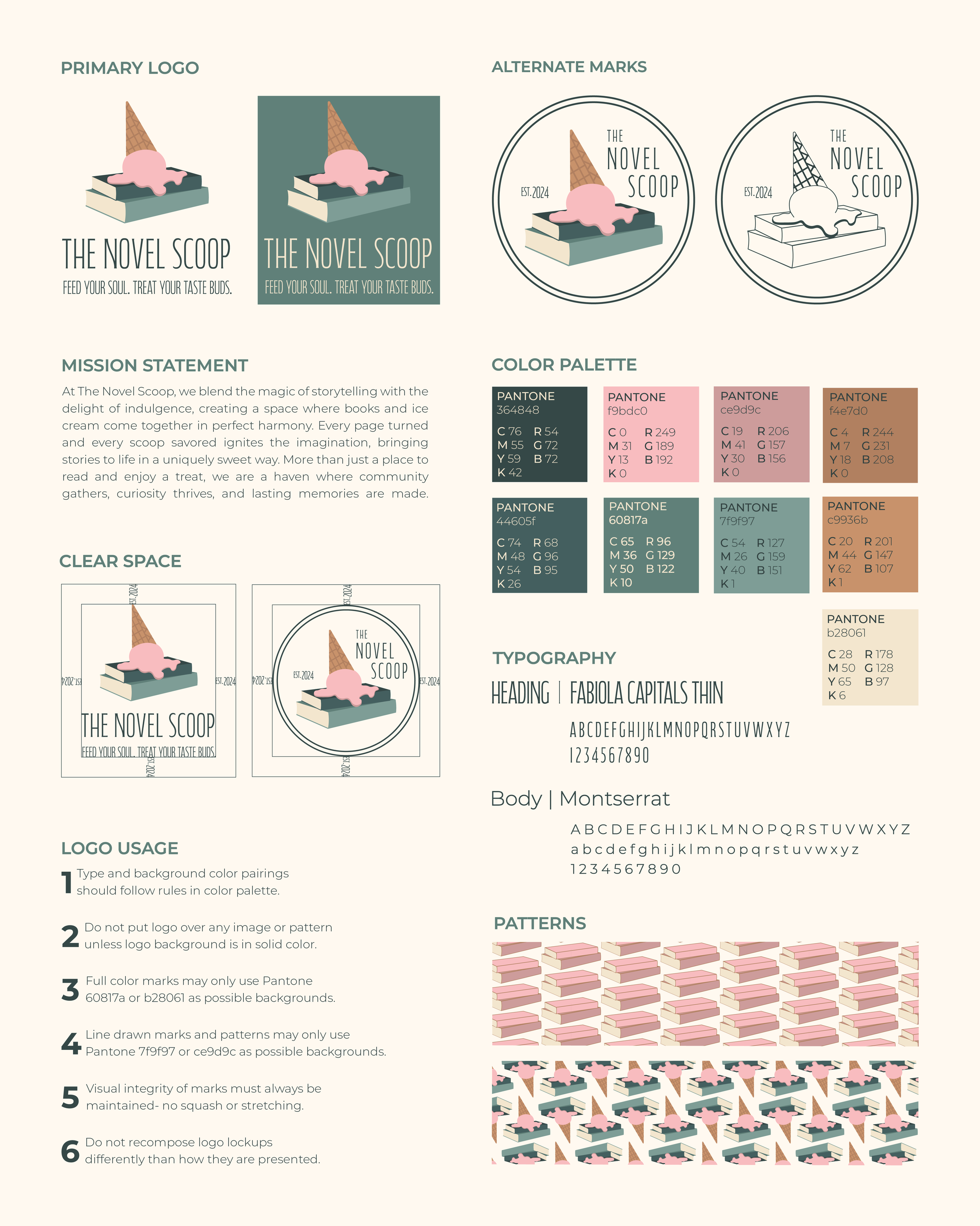 This project focused on developing a cohesive branding package for a fictitious restaurant, including a logo, color palette, typography, and collateral. My goal was to create an illustrative yet balanced logo that maintained clarity without being overly decorative. Careful consideration was given to color choices to ensure a refined and harmonious palette. Through class critiques, I selected Concept 32 for further refinement and ultimately chose Fabiola Capitols Thin as the typeface. Recognizing that the original brand name was too long for effective design, I revised it to enhance usability. I also explored alternative compositions for the illustration and adapted the design for versatility across various applications. To further establish the brand identity, I developed two patterns and alternative collateral forms, ensuring visual consistency across different media. The final stage involved fine-tuning design elements and applying them to collateral that reflected the restaurant’s unique blend. The project culminated in a comprehensive spread showcasing the primary and alternate logos, color palette, and collateral applications.